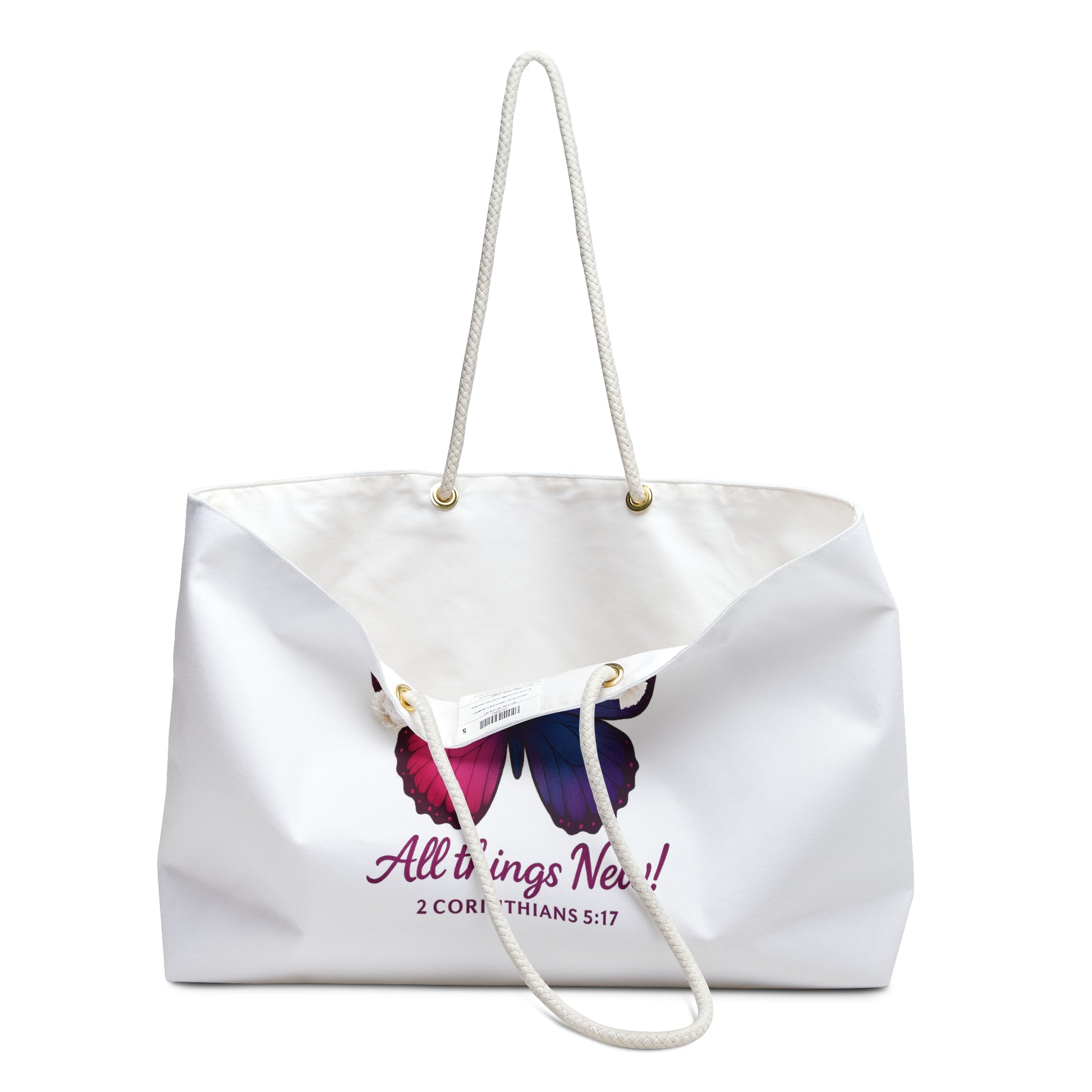 The All Things New Butterfly Weekender Bag is a stylish and inspirational travel tote perfect for weekend getaways. This spiritual symbol design is a great gift for her and serves as a reminder of new beginnings. Ideal for those who enjoy traveling, exploring, and seeking adventure. Perfect for vacations, weekend trips, beach days, or any occasion where a spacious and trendy bag is needed.