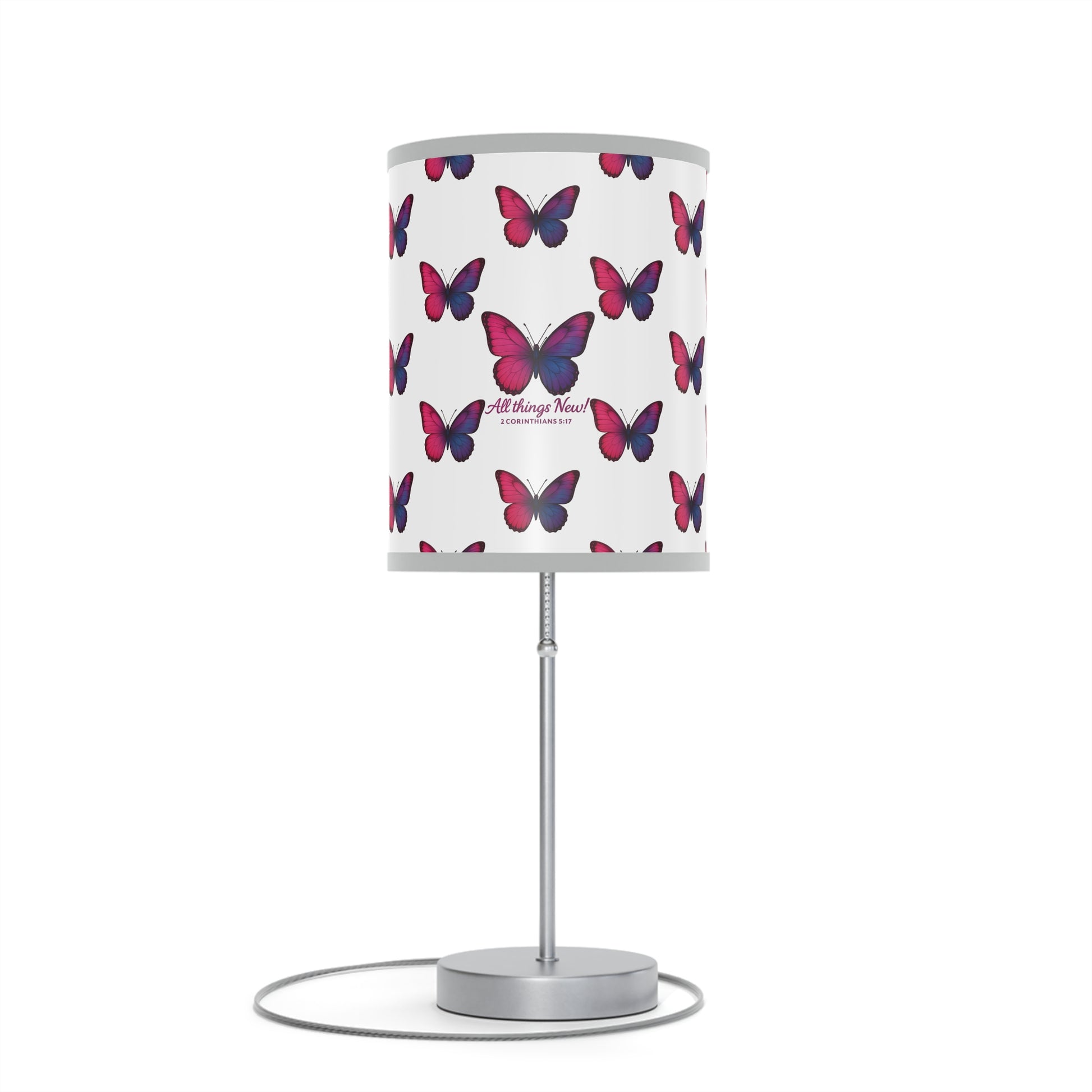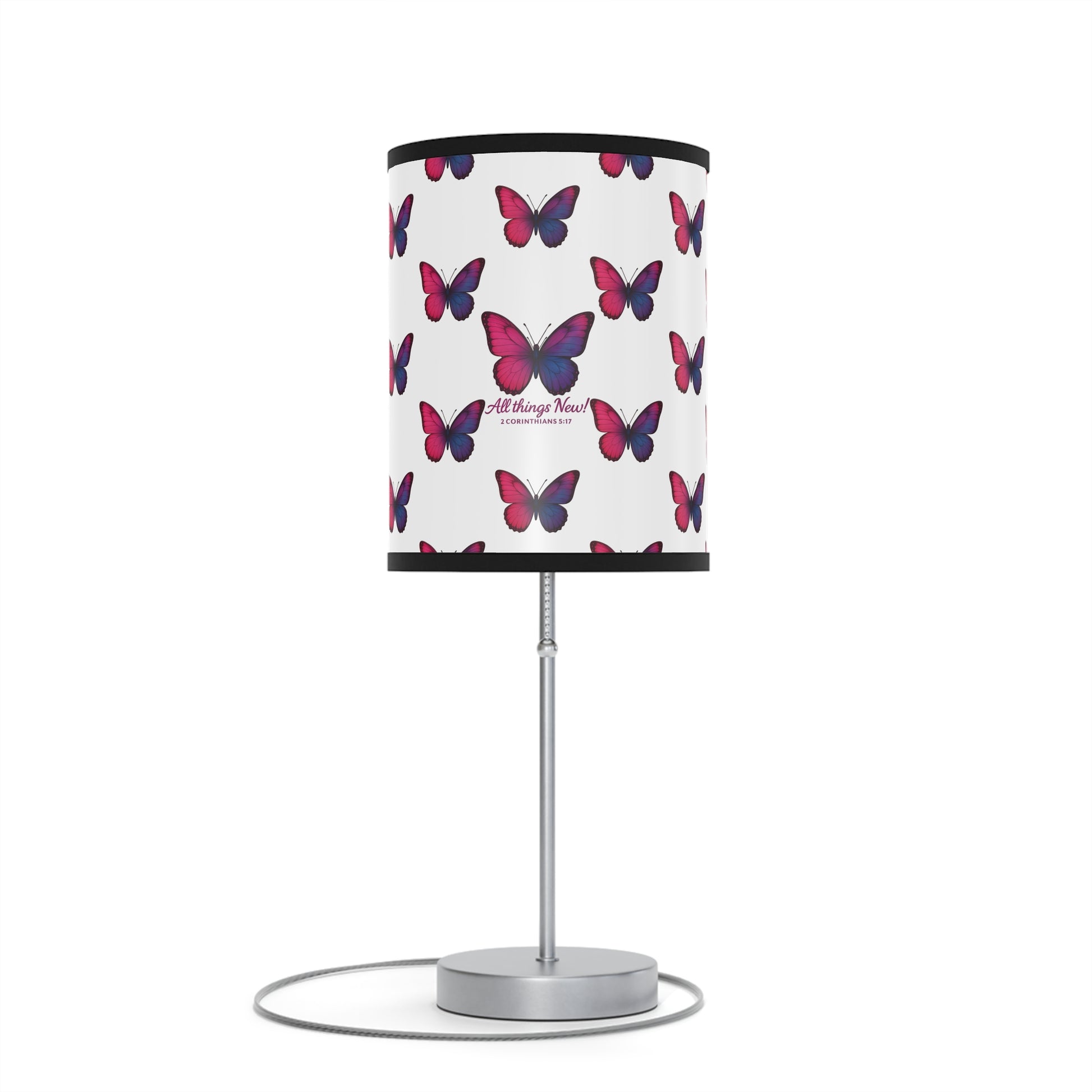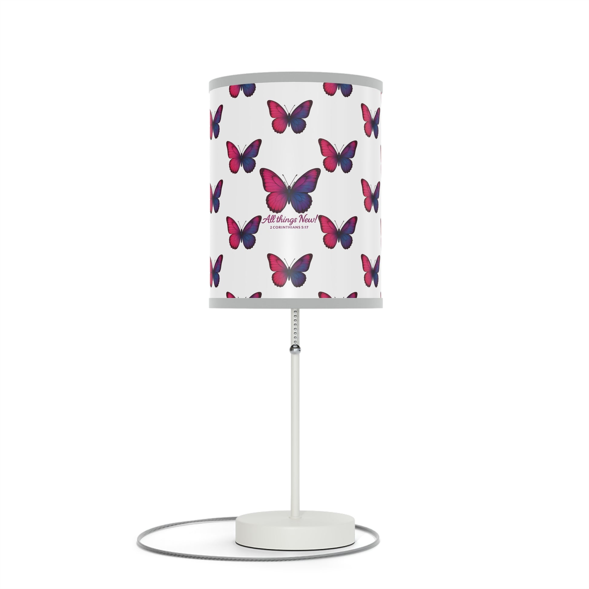 An Inspirational Lamp Stand with an All Things New design, featuring a high-res printed shade with a polyester fabric trim. This lamp provides warm and cozy lighting, ideal for adding a touch of inspiration to any room. Perfect for those looking to brighten up their space with a meaningful message.