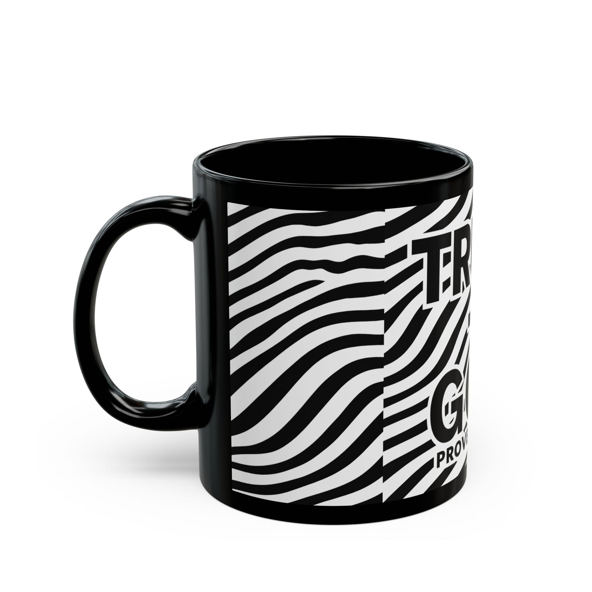Motivational black mug featuring "Trust God' Proverbs 3:5-6 with a sleek zebra print design, perfect for those seeking inspiration and faith while enjoying their morning coffee. Ideal gift for those who trust in God and appreciate religious-themed drinkware. Relevant for birthdays, Christmas, Easter, or any special occasion.